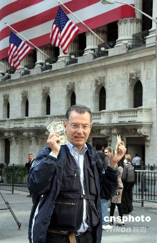 圖:外國(guó)游客手拿美鈔紐交所前留影