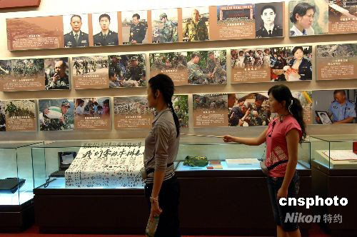 9月20日上午,中國人民革命軍事博物館青年講解員正在為“‘萬眾一心 眾志成城’--抗震救災(zāi)主題展覽”欄目背誦講解詞。由中共中央宣傳部、國家發(fā)展和改革委員會、解放軍總政治部共同主辦的此項展覽,將于9月21日正式對公眾開放。該展覽為汶川大地震后,北京舉辦的反映抗震救災(zāi)工作,規(guī)模最大,文物最多,圖片形象最為詳盡的展覽之一。中新社發(fā) 鄒憲 攝