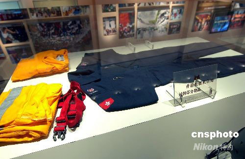中國汶川大地震救災(zāi)工作中,香港抗震救災(zāi)救援隊隊員穿過的救災(zāi)服裝在展會柜臺中展出。