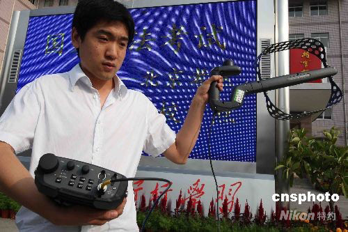 北京市司法局與北京市無線電管理局等按照“人防”與“技防”相結合,采用新型的技術設備--無線耳機探測器和全功能考場信號擾斷儀配備給考點。對疑似利用無線電通訊設備作弊或與考場外無線電通訊設備串通作弊的信號進行監(jiān)測,必要時采取技術手段予以阻斷。對已經(jīng)確認,情況屬實,違反治安管理規(guī)定或涉嫌犯罪的,交由公安機關依法查處。中新社發(fā) 任海霞 攝
