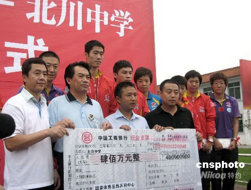 圖:中國乒乓球隊向北川中學(xué)捐贈400萬元