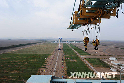 這是轉運現場。 9月20日15時15分,神七載人飛船、長征二號F運載火箭和逃逸塔組合體,順利垂直轉運至發(fā)射區(qū),標志著神七任務已進入最后的發(fā)射準備階段。 新華社記者 李剛 攝