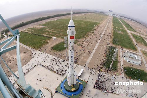 備受矚目的神舟七號載人航天飛行任務實施在即,目前,神舟七號船、箭、塔組合體已順利垂直轉運至中國載人航天發(fā)射場發(fā)射架,整裝待發(fā)。中新社發(fā) 楊志遠 攝