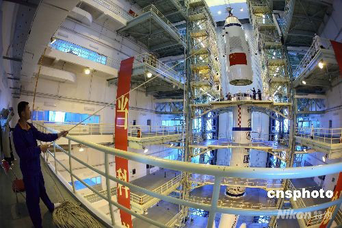 備受矚目的神舟七號載人航天飛行任務(wù)實施在即,目前,飛船、火箭、逃逸塔已在酒泉衛(wèi)星發(fā)射中心總裝測試廠房順利完成對接。中新社發(fā) 楊志遠 攝