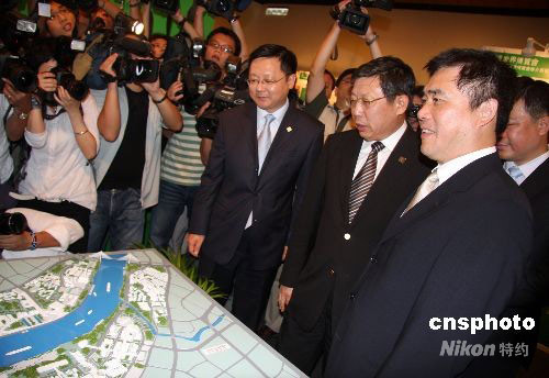 9月22日,“2010上海世界博覽會推介會”暨“走進世界博覽會”展覽活動在臺北開幕。出席開幕式的臺北市市長郝龍斌(右一)、上海常務副市長楊雄(右二)一起參觀上海世博會整體規(guī)劃展覽。中新社發(fā) 陳立宇 攝
