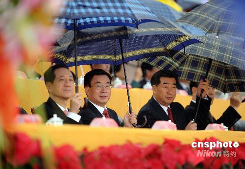 9月23日上午,干旱少雨的銀川降下甘露,寧夏回族自治區(qū)成立50周年慶祝大會(huì)在銀川覽山劇場隆重召開,中共中央政治局常委、中央紀(jì)委書記賀國強(qiáng)率中央代表團(tuán)出席。中新社發(fā) 廖攀 攝
