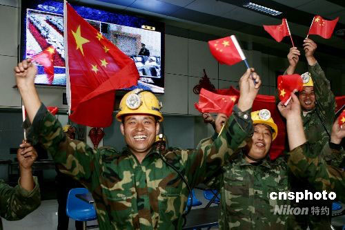 9月25日晚,安徽淮北安徽恒源煤電公司的礦工們揮舞國(guó)旗歡呼“神七”發(fā)射成功。當(dāng)日,該公司上千名礦工收看了神舟七號(hào)飛船發(fā)射的電視直播。中新社發(fā) 黃啟軍 攝