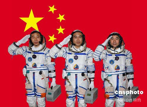 執(zhí)行神舟七號載人航天飛行任務(wù)的航天員翟志剛(中)劉伯明(右)景海鵬(左)向祖國和人民致以莊嚴(yán)的軍禮。中新社發(fā) 秦憲安 攝