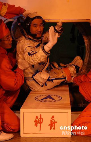 翟志剛進(jìn)入神舟七號(hào)飛船返回艙。中新社發(fā) 秦憲安 攝