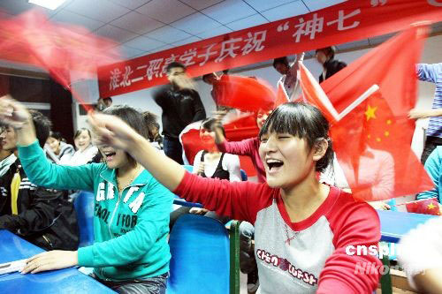 9月25日晚,安徽省淮北市二職高的學(xué)生在收看“神七”發(fā)射的現(xiàn)場(chǎng)直播。當(dāng)晚,我國(guó)第三艘載人航天飛船——神舟七號(hào)飛船的升空牽動(dòng)了億萬(wàn)中國(guó)人的心。中新社發(fā) 李博 攝