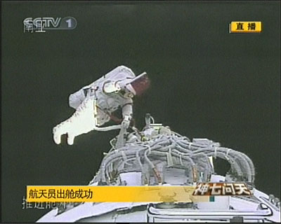 9月27日,“神七”航天員翟志剛在艙外活動(dòng),展出五星紅旗。