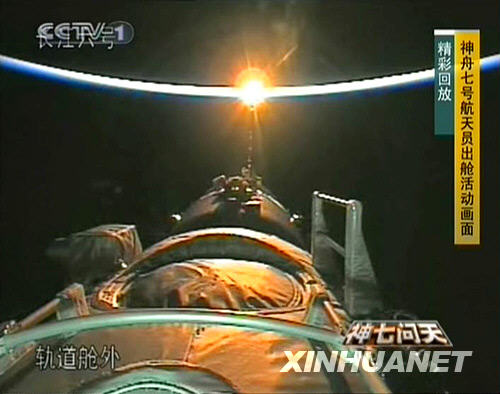 9月27日,神舟七號(hào)艙外的攝像機(jī)拍攝到的太空日落的壯觀景象,金色的太陽(yáng)給地球和神舟七號(hào)鑲上了金邊,景色分外美麗。新華社發(fā)(電視截圖)