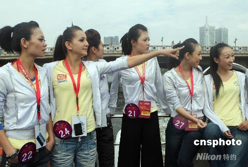 9月27日,正在天津參加“2008東麗湖世界最佳模特大賽(best model of the world)中國(guó)區(qū)總決賽”的50名男女選手,乘游船游覽天津市區(qū)新貌,海河風(fēng)光。中新社發(fā) 錢(qián)興強(qiáng) 攝