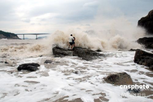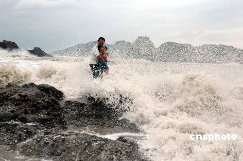 9月28日,受超強(qiáng)臺風(fēng)“薔薇”影響,浙江溫州市洞頭島海域已是波濤洶涌,海礁上掀起的巨浪高達(dá)10多米。下午2時(shí)許,一對外地父女在海邊游玩時(shí)不慎被突漲的潮水困在礁石上,隨時(shí)可能被海浪吞噬。正在海邊巡邏的洞頭邊防大隊(duì)官兵發(fā)現(xiàn)險(xiǎn)情后,迅速展開緊急營救,成功將父女從海浪中安全救上岸。中新社發(fā) 吳水斌 攝