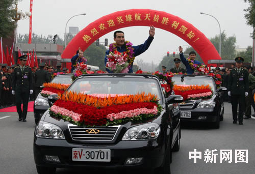 神舟七號(hào)飛船航天員翟志剛、劉伯明、景海鵬29日乘專機(jī)抵達(dá)北京后,當(dāng)日回到北京航天城,受到民眾的夾道歡迎。中新社記者 齊彬 攝