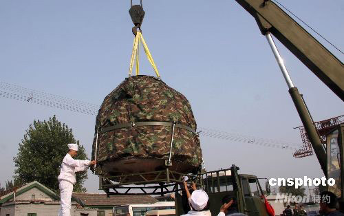 9月30日下午,神舟七號載人飛船返回艙乘專列由內(nèi)蒙古運抵北京昌平火車站,“神七”主著陸場正式將返回艙移交給飛船研制單位——中國空間技術研究院。圖為工作人員將返回艙從火車吊裝到專用汽車上,中國空間技術研究院在車前懸掛上迎接返回艙回家的標語。