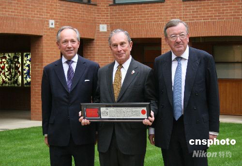 當(dāng)?shù)貢r間6日下午,訪問倫敦的紐約市長邁克爾·布隆博格獲頒倫敦金融城“自由民”證書。擁有該榮譽后,布隆博格將有權(quán)趕著羊和牛通過倫敦橋。圖為布隆博格手持證書與倫敦金融城資源與政策委員會主席斯圖亞特·弗雷澤(右)和副主席邁克爾·斯奈德(左)合影。中新社發(fā) 李鵬 攝