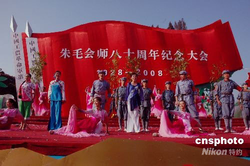 十月七日,八十年前朱德領(lǐng)導(dǎo)的南昌八一起義部隊與毛澤東領(lǐng)導(dǎo)的秋收起義部隊會師紀(jì)念大會,在井岡山龍市朱毛會師廣場隆重舉行。紀(jì)念大會現(xiàn)場熱鬧非凡,鞭炮、鑼鼓、彩旗讓八十年前熱鬧喜慶的場面重現(xiàn)。中新社發(fā) 段長征 攝