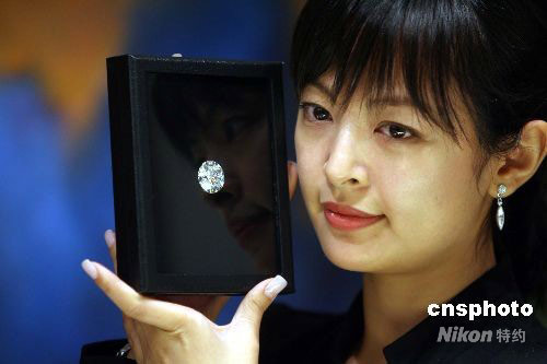 十月八日,香港佳士得向傳媒展示一批將于十二月二日拍賣的瑰麗珠寶首飾,圖中的四十四點(diǎn)四六克拉完美無暇巨鉆,估價(jià)超過六千萬(wàn)港元。中新社發(fā) 洪少葵 攝