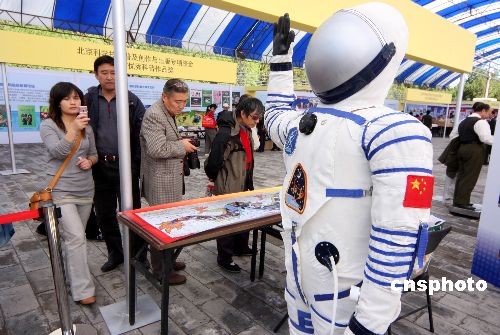 10月10日,“神七”模型和中國造“飛天”太空艙外航天服吸引眾多市民參觀拍照。當(dāng)日,“太空禮贊·中國‘神舟’載人航天展覽”亮相北京地壇圖書節(jié)。據(jù)悉,按照1:5比例制作的‘神舟七號’飛船模型可謂是本次展覽的一大亮點(diǎn),這也是該模型首次在公眾面前展示,同類模型目前只在北京航天飛行控制中心內(nèi)有一個。中新社發(fā) 吳芒子 攝