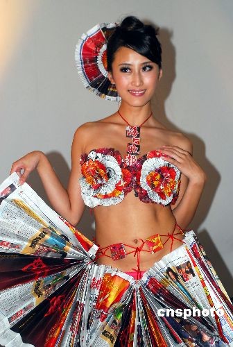 2008年10月11日,海南大學(xué)藝術(shù)學(xué)院05級(jí)服裝設(shè)計(jì)班學(xué)生用收集的近千份廢舊報(bào)紙,運(yùn)用縷空、抽褶、折疊、編織等工藝手法,制成10多套情趣盎然的創(chuàng)意服裝,并由學(xué)生模特穿著走秀。這些服裝是變廢為寶的藝術(shù)品,它利用報(bào)紙本身的色彩、圖案和文字表達(dá)張揚(yáng)的個(gè)性,展現(xiàn)海南熱帶風(fēng)情。中新社發(fā) 善平 攝