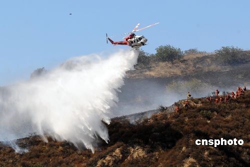 一架消防直升機(jī)在洛杉磯附近的山火現(xiàn)場實施空中滅火。中新社發(fā) 張煒 攝
