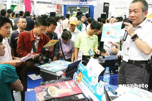 2008年10月16日,在蘇州國(guó)際博覽中心開幕的以“綠色科技、數(shù)字生活”為主題的第七屆中國(guó)蘇州電子信息博覽會(huì)上,許多參展企業(yè)豐富多彩的促銷活動(dòng),引人入勝,成為該展會(huì)上的一大亮點(diǎn)。 中新社發(fā) 蘇秀 攝