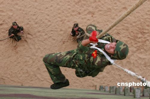 10月16日至20日,濟(jì)南軍區(qū)組織為期四天的偵察兵作戰(zhàn)骨干大比武活動(dòng),此次比武演練。在課目、內(nèi)容設(shè)置上借鑒“愛(ài)爾納”國(guó)際偵察兵比武法則,采取動(dòng)態(tài)考核和靜態(tài)考核結(jié)合的方式,以實(shí)戰(zhàn)背景為牽引,以高新裝備為平臺(tái),突出孤軍作戰(zhàn)、體系作戰(zhàn)、信息化作戰(zhàn)等多種演練方式。圖為官兵采取“空手導(dǎo)”方式進(jìn)行攀登訓(xùn)練。中新社發(fā) 崔成俊 攝