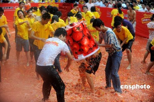 10月19日,一場(chǎng)番茄大戰(zhàn)在廣東省東莞華南MALL狂熱上演。為避免砸傷事故,15噸西紅柿經(jīng)過(guò)專門的軟化。此次狂歡活動(dòng)吸引了上萬(wàn)人觀看。游客分批進(jìn)入番茄池狂砸,根本不管比賽規(guī)則,不要分?jǐn)?shù),只要開心。中新社發(fā) 許康平 攝