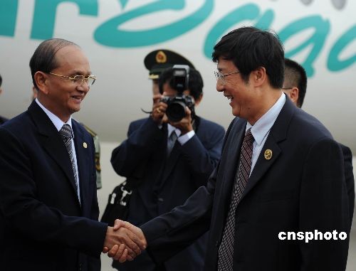 十月二十日,緬甸總理登盛飛抵廣西南寧,出席將于二十二日舉行的第五屆中國—東盟博覽會。他在南寧國際機(jī)場受到廣西官員的熱烈歡迎。中新社發(fā) 蔣雪林 攝