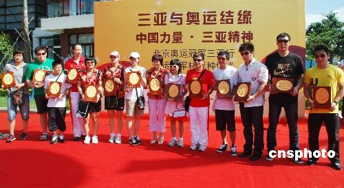 10月21日,參加“三亞城市精神評選暨奧運(yùn)冠軍三亞行活動”的14位奧運(yùn)會冠軍在三亞灣留下“冠軍手印”。中新社發(fā) 尹海明 攝