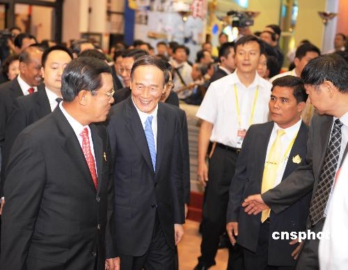 十月二十一日,中國—東盟博覽會主題國柬埔寨館舉行開館儀式。儀式結束后,洪森、王歧山共同巡視中國—東盟博覽會展館柬埔寨館。中新社發(fā) 蔣雪林 攝