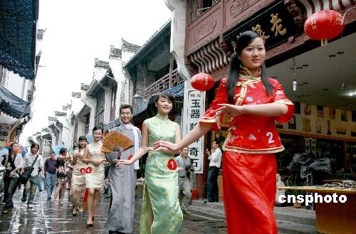 2008年10月22日,黃山魅力青年在屯溪老街舉行風(fēng)情模特秀。安徽黃山市為提升城市品位,充分展示黃山青年的良好形象,黃山魅力青年首次在千年古鎮(zhèn)的屯溪老街舉行風(fēng)情模特秀。魅力青年模特在古色古香、徽風(fēng)遺韻的屯溪老街“秀”出了風(fēng)情萬種、人與自然和諧共存的美好景象。中新社發(fā) 方也廣德 攝