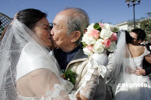 10月26日,11對(duì)來(lái)自全國(guó)各地的新人在北京舉行集體婚禮;槎Y中,中央美術(shù)學(xué)院的吳介琴教授是所有新人里年齡最大的,今年已經(jīng)81歲了。他的愛人蔣曉輝女士今年58歲,兩人相識(shí)于網(wǎng)絡(luò)。
