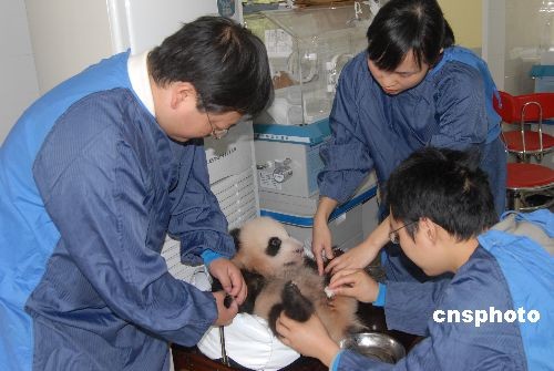 圖為飼養(yǎng)員給平平人工排便。中新社發(fā) 羅小韻 攝