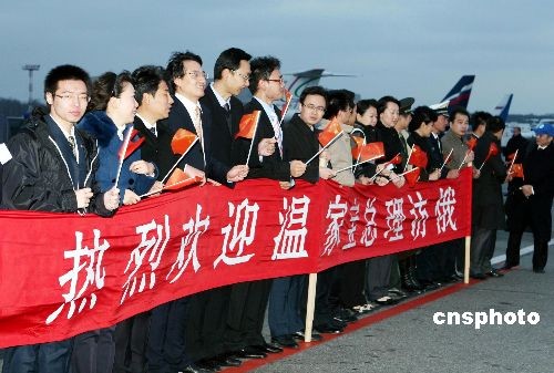 溫家寶在機(jī)場(chǎng)受到俄副外長(zhǎng)博羅達(dá)夫金等俄方官員的熱情迎接并出席了歡迎儀式。