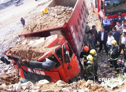 圖:大卡車制動(dòng)失靈撞向山石 司機(jī)被埋