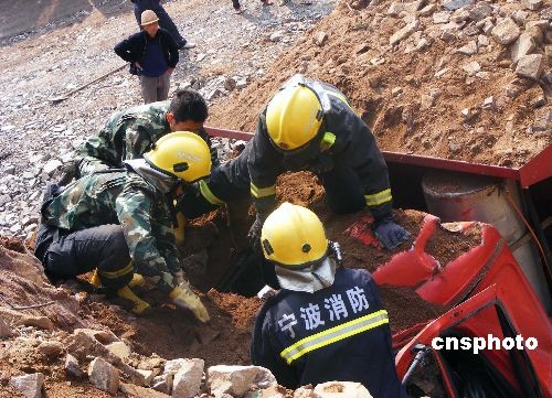 10月27日9時(shí),浙江省寧波慈城鎮(zhèn)黃山村上演驚人一幕:一輛滿載石塊車牌為皖N60589的大卡車因?yàn)橹苿?dòng)失靈,在近50度的山路陡坡上演飄移,撞向山路上的懸崖峭壁,導(dǎo)致山體局部塌方,整個(gè)車身被滾落的山石掩埋。消防部門接警后第一時(shí)間趕往現(xiàn)場(chǎng),成功將被困司機(jī)救出。中新社發(fā) 何蔣勇 攝