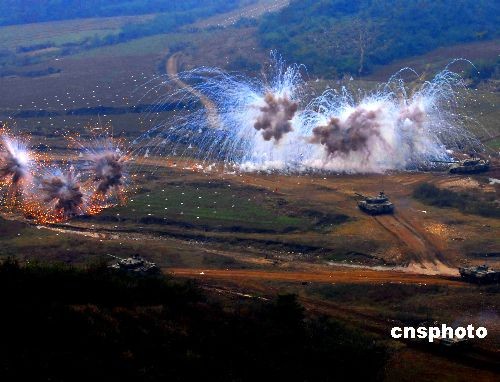 10月28日,代號為“前鋒--2008”的中國人民解放軍濟南軍區(qū)某裝甲旅進(jìn)攻戰(zhàn)斗檢驗性實兵實彈演習(xí),在確山合同戰(zhàn)術(shù)訓(xùn)練基地展開。演習(xí)以信息化條件下的聯(lián)合作戰(zhàn)為背景,突出裝甲機械化部隊在復(fù)雜電磁環(huán)境下的山地進(jìn)攻戰(zhàn)法,鍛煉指揮員和指揮機關(guān)信息化條件下的組織能力、諸軍兵種協(xié)同作戰(zhàn)能力、部隊綜合保障能力、全面提高現(xiàn)代化部隊的戰(zhàn)斗能力。中新社發(fā) 宋吉河 攝