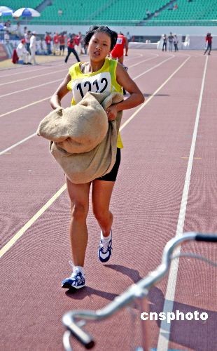 圖為女子60米搶收糧食進(jìn)倉比賽時選手拿空袋起跑。