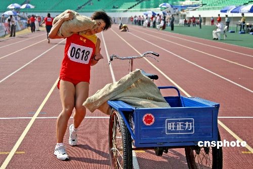 圖為女子60米搶收糧食進(jìn)倉比賽中選手把“搶收的糧食”裝上三輪車。中新社發(fā) 傅丹丹 攝