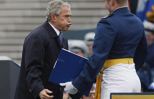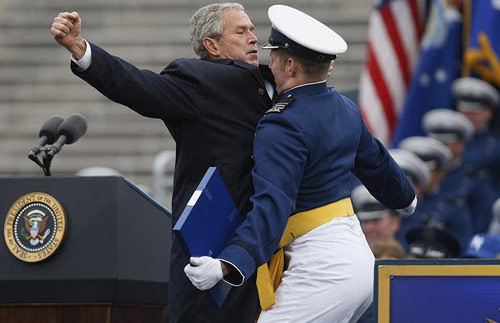 2008年5月28日,美國總統(tǒng)布什在科羅拉多州出席空軍學(xué)院畢業(yè)典禮。在典禮上,布什除了按照一般程序發(fā)表講話外,還與畢業(yè)生們玩起撞胸的角力游戲,給畢業(yè)生演示舞蹈動作,活潑可愛,顯示出了老頑童的本色。