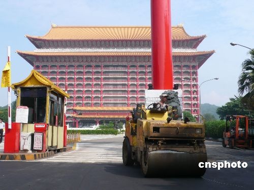 大陸海協(xié)會會長陳云林訪臺將下榻在有50多年歷史的臺北市圓山大飯店。為了迎接貴客的到來,有關(guān)工作人員正在平整飯店門前的路面。中新社發(fā) 于晶波 攝