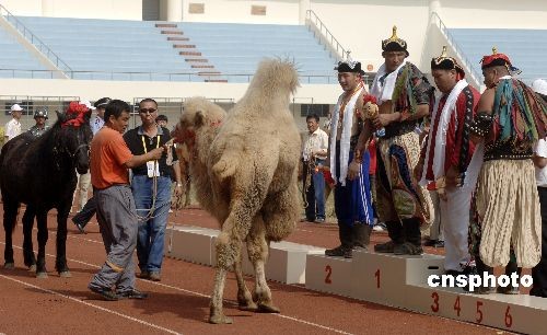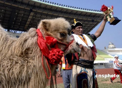 內蒙古選手獲得冠軍并獎勵駱駝一頭。中新社發(fā) 王東明 攝