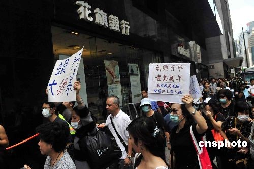 十月三十一日中午,香港約二百名購買雷曼產(chǎn)品的投資者,在中環(huán)八間銀行的總行及分行外游行,抗議銀行不負(fù)責(zé)任,誤導(dǎo)他們投資。中新社發(fā) 譚達(dá)明 攝
