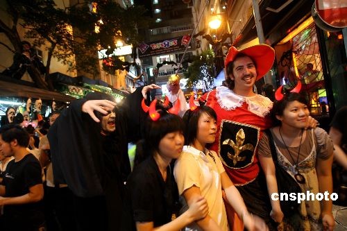 十月三十一日晚,香港中區(qū)蘭桂坊一帶人聲鼎沸,大批市民、游客在擁擠的酒吧街激情狂歡,歡度一年一度的西方“萬圣節(jié)”。中新社發(fā) 洪少葵 攝