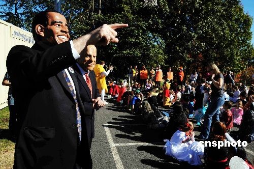 當(dāng)?shù)貢r(shí)間十月三十一日下午二點(diǎn),美國(guó)弗吉尼亞埃西蘭小學(xué)舉行一年一度的全校萬(wàn)圣節(jié)假面游行,當(dāng)校長(zhǎng)米蘭達(dá)先生等扮演的總統(tǒng)參選人“奧巴馬”“麥凱恩”出現(xiàn)在孩子們面前,孩子們發(fā)出陣陣的歡呼聲。中新社發(fā) 邱江波 攝