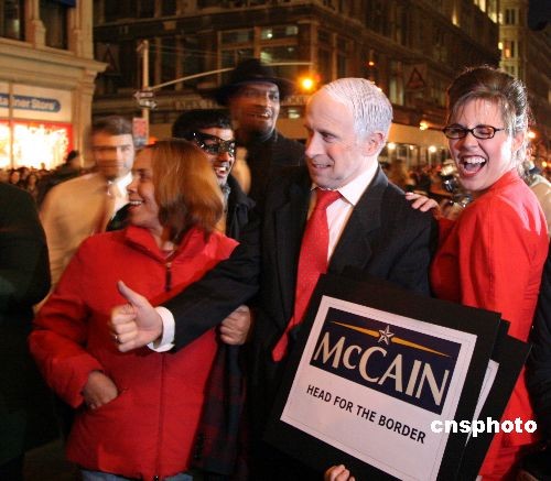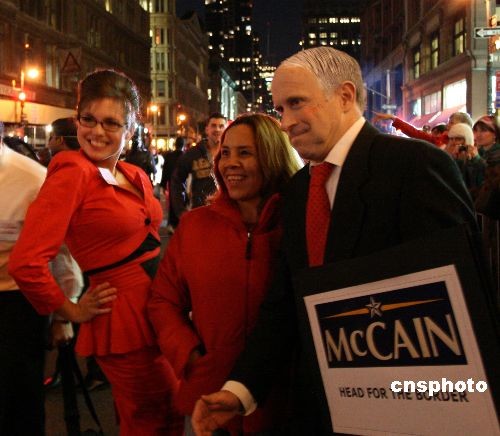 當(dāng)?shù)貢r(shí)間10月31日晚,第三十五屆“紐約格林威治村萬(wàn)圣節(jié)游行”隆重登場(chǎng),曼哈頓六大道人山人海,盡管面對(duì)金融風(fēng)暴,但紐約客依然“群魔亂舞”,極盡瘋狂。有人裝扮成總統(tǒng)候選人麥凱恩和副總統(tǒng)候選人佩林,但立刻有奧巴馬的粉絲向他們高喊:奧巴馬!中新社發(fā) 彭偉祥 攝