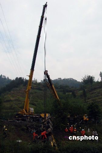11月2日11時50分許,渝黔高速公路重慶至一品段10公里處,一輛長江牌吊車因爆胎導(dǎo)致車輛失控,沖出護欄發(fā)生側(cè)翻,造成1人死亡,1人重傷。中新社發(fā) 張東清 攝