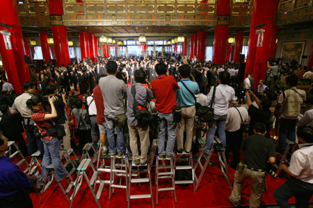 大陸海協(xié)會(huì)會(huì)長(zhǎng)陳云林三日率協(xié)商代表團(tuán)來(lái)臺(tái),大批媒體記者在臺(tái)北圓山飯店采訪。